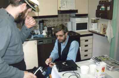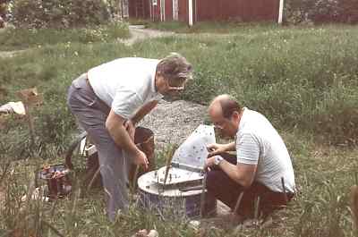 Kustavin leirillä. Kuvassa vas. Heikki OH1BX ja Veikko OH1AWW virittämässä "Moppea".