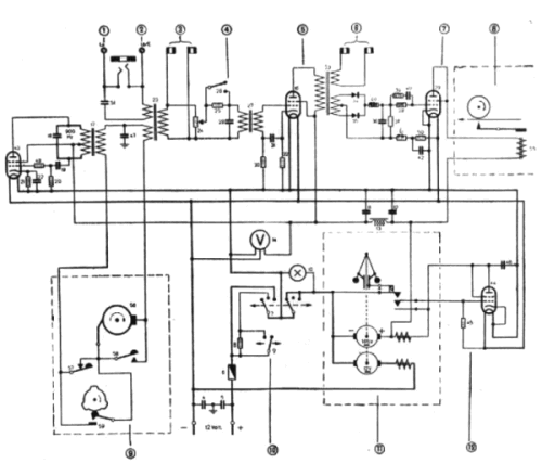 | Kuvan kytkentäkaavio on periaatteellinen. Siitä on jätetty pois mm. moottorigeneraattorin häiriönpoistoelimet ja 12-napaisen liittimen kytkennät. Äänijaksovärähdin (putki vasemmalla) on viritetty kiinteästi 900j/s taajuudelle. Muuntajan avulla johdetaan lähettimen virtapiirin äänijaksovärähtely, jota katkotaan lähettimessä kirjainmerkin tahdissa. Katkottu äänijaksovärähtely johdetaan muuntajan välityksellä johtoruuveihin ja niistä edelleen vastaanottimeen. Vastaanotossa samoista koskettimista tuleva signaali johdetaan muuntajan läpi vastaanottovahvistimeen. Muuntajan toisiopuolella on ulosotot ja koskettimet myös radiovastaanottoa varten sekä voimakkuussäädin. Keskellä olevan muuntajan läpi signaali siirtyy aluksi putkivahvistimeen ja sen jälkeen taas muuntajan läpi kuivatasasuuntaajalle, jossa ne tasasuunnataan. Tasasuunnatut pulssit aiheuttavat muutoksia viimeisen putken anodijännitteessä, joka on sarjassa magneetin käämin kanssa saaden aikaan magneetin ankkurin liikkeen ja merkkiviivan painalluksen. Alhaalla oleva putki säätää keskipakoiskytkinten antaman tiedon perusteella sähkömoottorin kierrosnopeutta. |